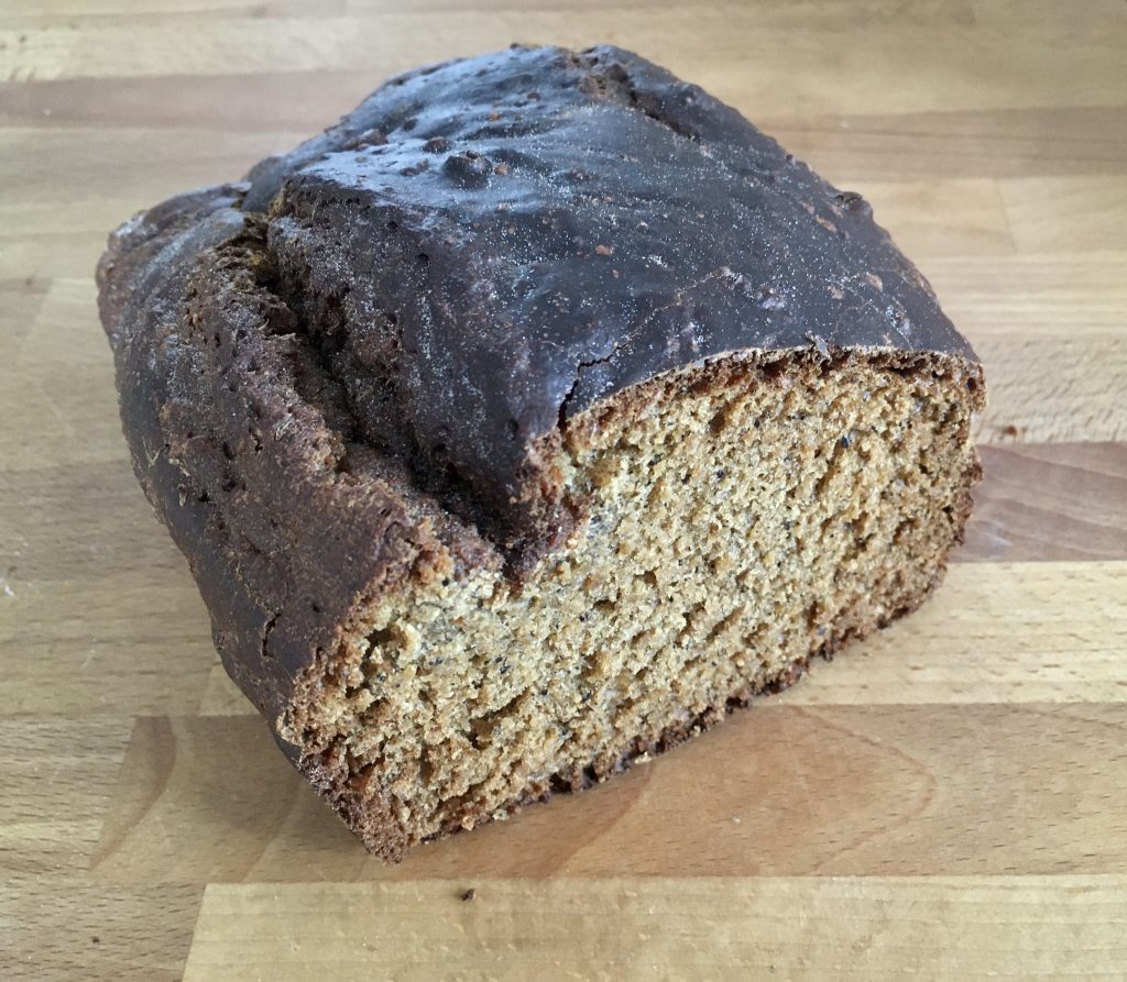 Cuire environ 50 minutes. Le pain est cuit quand le dessus sonne creux (comme tous les pains). Surveillez la cuisson, car la forme du moule et la chaleur du four (tournante ou non) peuvent faire varier la cuisson.